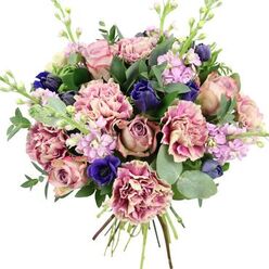 This wonderful arrangement is bursting with blue hydrangeas, light purple roses, green lisianthus, white spray roses, Ammi visnaga, pink bouvardia and pink astilbe to create a magical combination that will make a great impression! A very stylish gift that you can send to your family and friends!